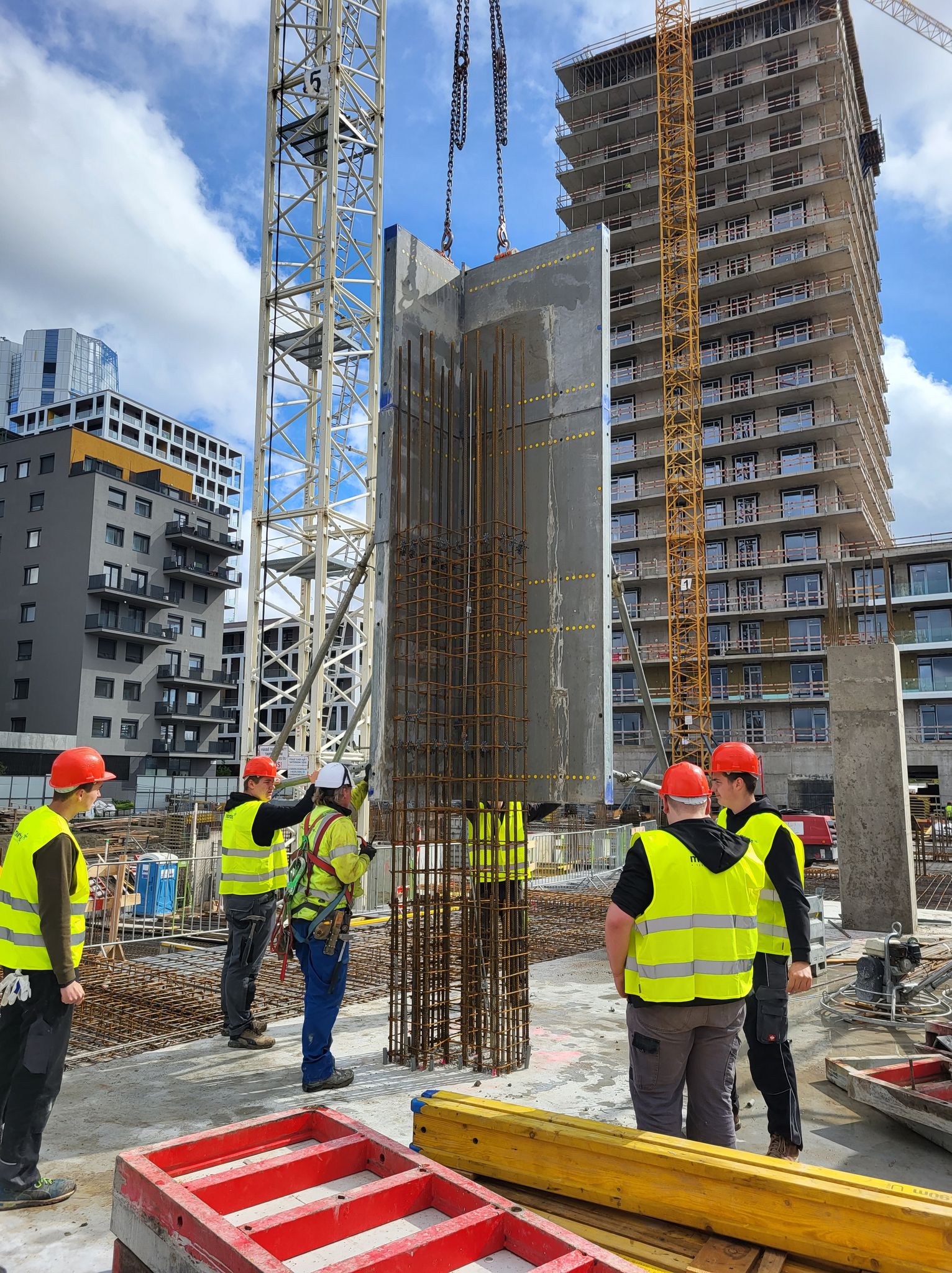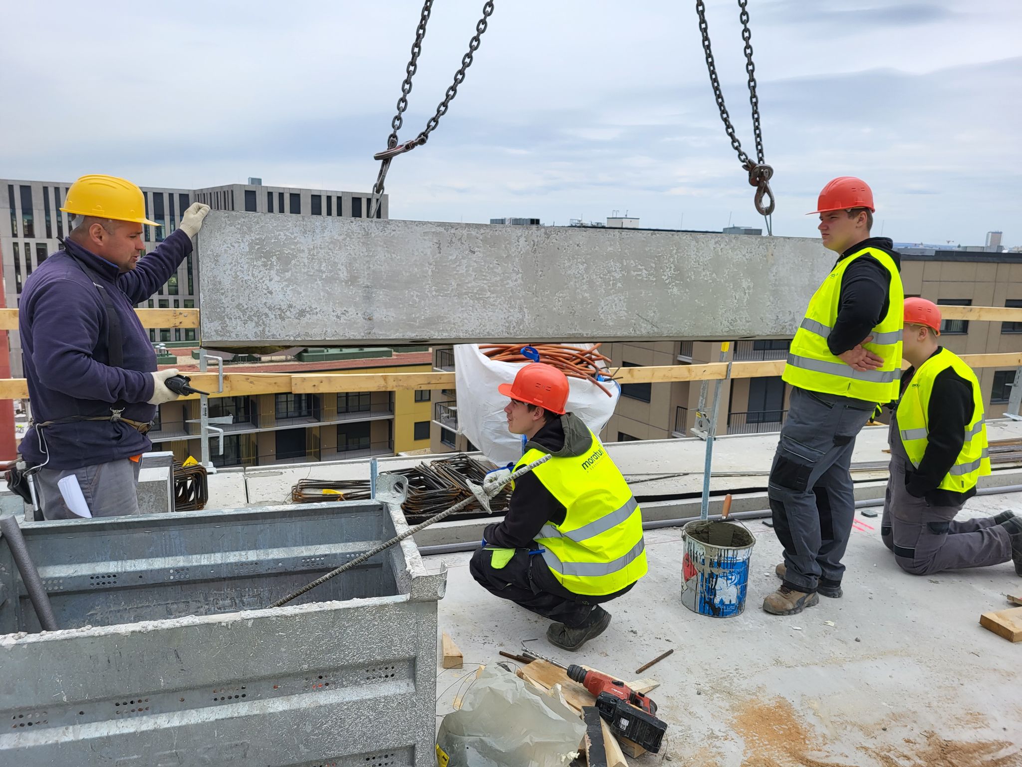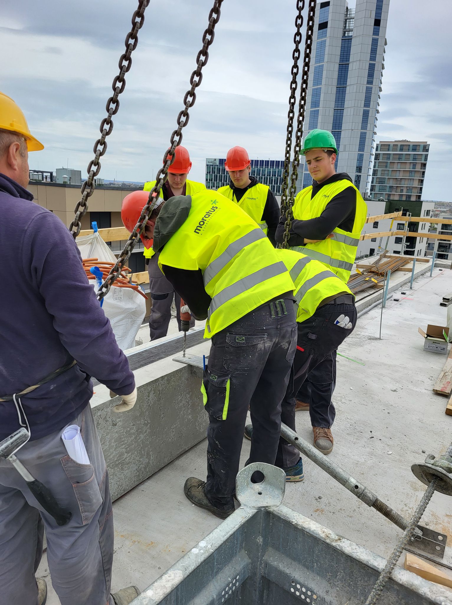 Az első napon a Moratus szerkezetépítő cég BudaPart kivitelezési projektjébe nyerhettek betekintést: egy monolit vasbeton gerenda fenékzsaluzását nézhették végig, majd egy előregyártott attika falpanel daruzásában, elhelyezésében és rögzítésében vehettek részt.